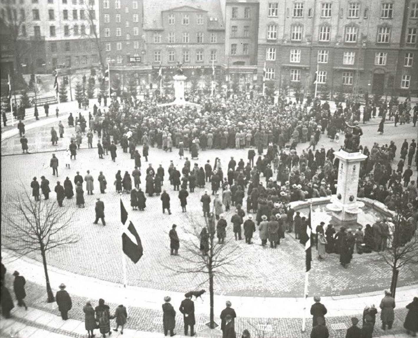 St. Thomas Plads. Springbrøndene indvies i anledning af kommunens 75-års jubilæum i 1932 (danskebilleder.dk)