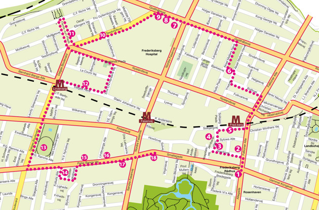 This City transformation process is very pronounced in 12. Dalgas Have, which we have now entered. The area houses the CBS Faculty of Languages and horseshoe-shaped residential flats and tower blocks with a square ground-plan. From 1906 the huge industrial and administration buildings of the cable and wire factory Nordiske Kabel- og Trådfabrikker were domiciled here, but in the 1970's the entire company moved to Glostrup. Now we pass under the old S-train railway which was originally established in 1879 as a branch line to Frederikssund. In 1934 it became an S-train line and from 2003 it has been part of the metro, which farther out meets the new Flintholm Station. In terms of passenger numbers, this station will be Denmark’s third largest station; connecting the metro and the S-train lines to Frederikssund and the Ringbanen from Hellerup to Ellebjerg.