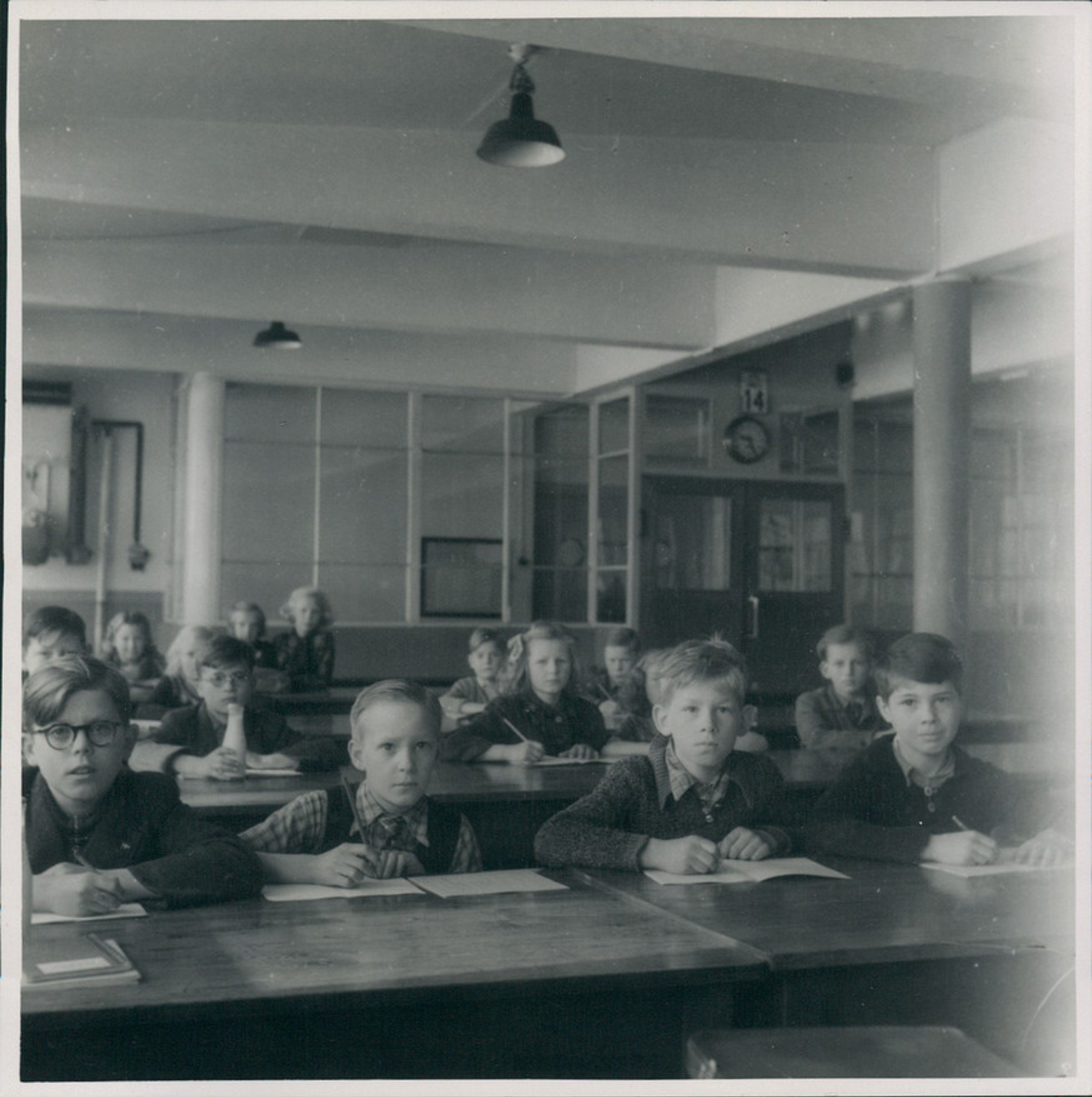Elever fra Søndermarkskolen får midlertidig undervisning i lokaler stillet til rådighed af firmaet Fisker & Nielsen på Peter Bangs Vej april 1945. Frederiksberg Stadsarkiv.