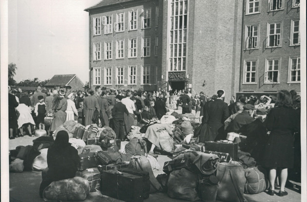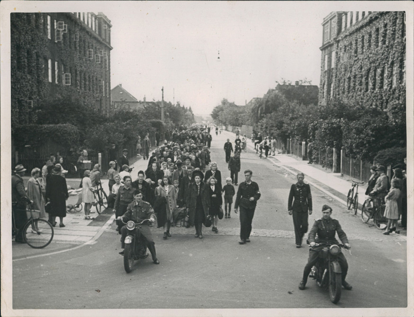 Tyske flygtninge forlader Søndermarkskolen 13. august 1945. Foto: Svend Liisberg. Frederiksberg Stadsarkiv.
