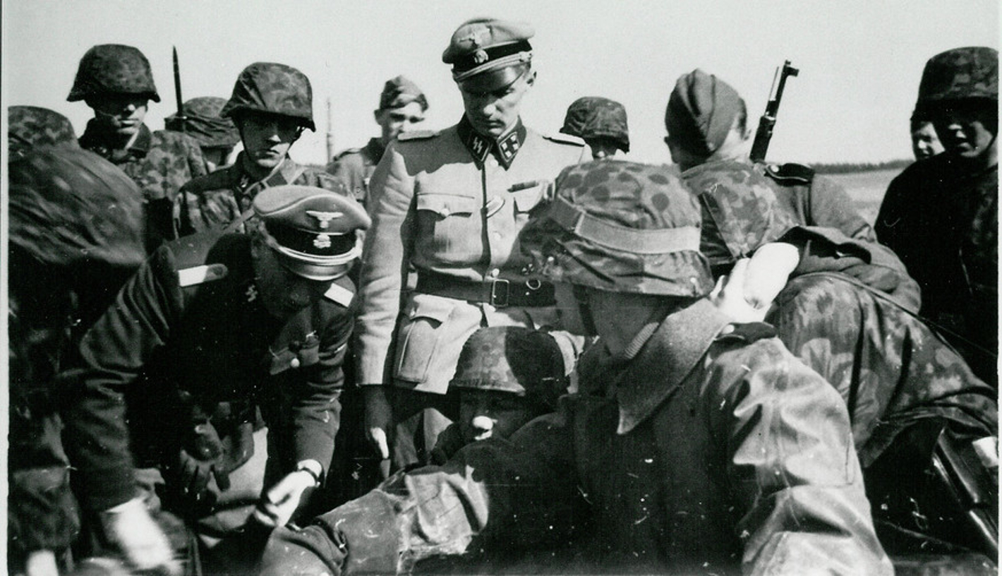 Christian Frederik von Schalburg omgivet af nogle af sine folk. Muligvis under en øvelse i Treskow-lejren. Frihedsmuseet.