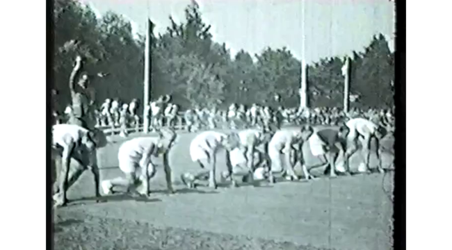 Elever fra de frederiksbergske skoler dyster i 60 meter løb ved skolernes idrætsdag på Frederiksberg Stadion 1949. Klippet varer 0.28 min.