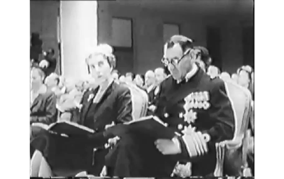 Indenrigs- og boligminister Aksel Møller taler ved indvielsen af det nye rådhus 9. maj 1953. Aksel Møller var medlem af Frederiksberg Kommunalbestyrelse 1937-1958. Han var borgmester 1948-1950 og 1954-1958. Fra "Rådhusfilmen".
