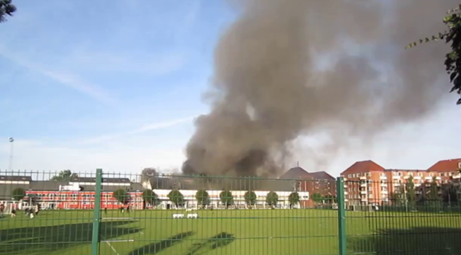 Optagelser fra den omfattende brand i KB-Hallen på Peter Bangs Vej 28. september 2011. Den brændende hal ses her fra Jens Jessens Vej.