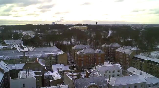 Et kig fra rådhustårnet ud over den vestlige del af et sneklædt Frederiksberg. Optagelserne stammer fra 17. december 2009.