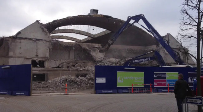 Optagelser fra nedrivningen af KB-Hallen på Peter Bangs Vej 25. februar 2015. Nedrivningen af hallen, der brændte 28. september 2011, begyndte 20. februar.