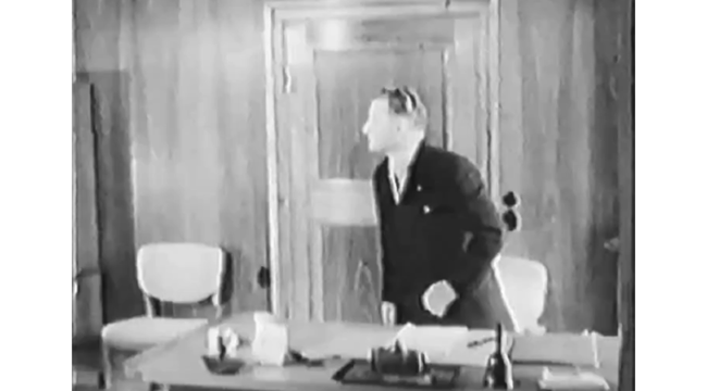 Repræsentanter for personaleorganisationerne overrækker en ny borgmesterkæde til borgmester Arne Stæhr Johansen 9. maj 1953. Klippet varer 0.43 min.