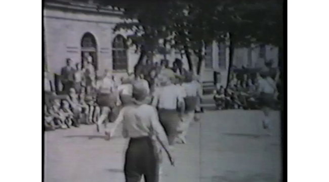Piger fra 1.g på Frederiksberg Gymnasium spiller basketball. Fra filmen "Frederiksberg Gymnasium 1946".