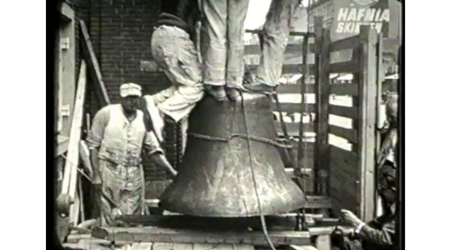 Til et rådhustårn hører et klokkespil. Rådhustårnet på Frederiksberg Rådhus er 70 meter højt fra terræn til toppen af radiomasten. Klokkespillet blev finansieret af en borgergave fra Frederiksbergs borgere til rådhuset ved rådhusets indvielse. Klokkenisten på filmen er Staff Ness. De første år var det ret fysisk krævende at være klokkenist. Med fødder og hænder måtte kokkenisten slå og trampe på spillebordets pedaler og tangenter. Senere er klokkespillet blevet elektrisk. Klippet er desværre uden lyd.