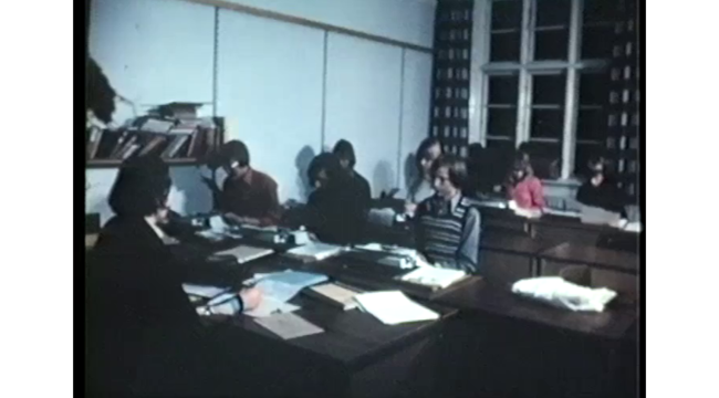 Der undervises i maskinskrivning på Frederiksberg Kommunes Fortsættelseskursus (FKFK) i 1975. Kurset blev oprettet i 1900 og tilbød fra starten aften- og ungdomsskoleundervisning i almindelige skolefag og efterhånden i et stadig større antal praktiske fag. Undervisningen foregik på kommunens skoler. Fra 1927 deltes kurset i to afdelinger: en ungdomsskole og en aftenskole. Fra 1962 oprettedes desuden kurser til teknisk og udvidet teknisk forberedelseseksamen samt senere den statskontrollerede prøve efter 9. og 10. klasse. Fra 1975 blev HF-enkeltfagskurserne lagt under FKFK og sammenlagt med den øvrige prøveforberedende undervisning i afdelingen: Frederiksberg Forberedelseskursus. Ved nedlæggelsen af FKFK i 1978 udskiltes kursets virksomhedsområder i selvstændige institutioner: Frederiksberg Forberedelseskursus (det senere Frederiksberg VUC), Frederiksberg Kommunes Ungdomsskole samt Frederiksberg Aftenskole. Klippet varer 16 sekunder.