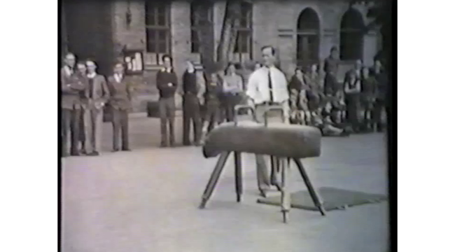 Drenge fra Frederiksberg Gymnasium springer over bukken. Fra filmen "Frederiksberg Gymnasium 1946".